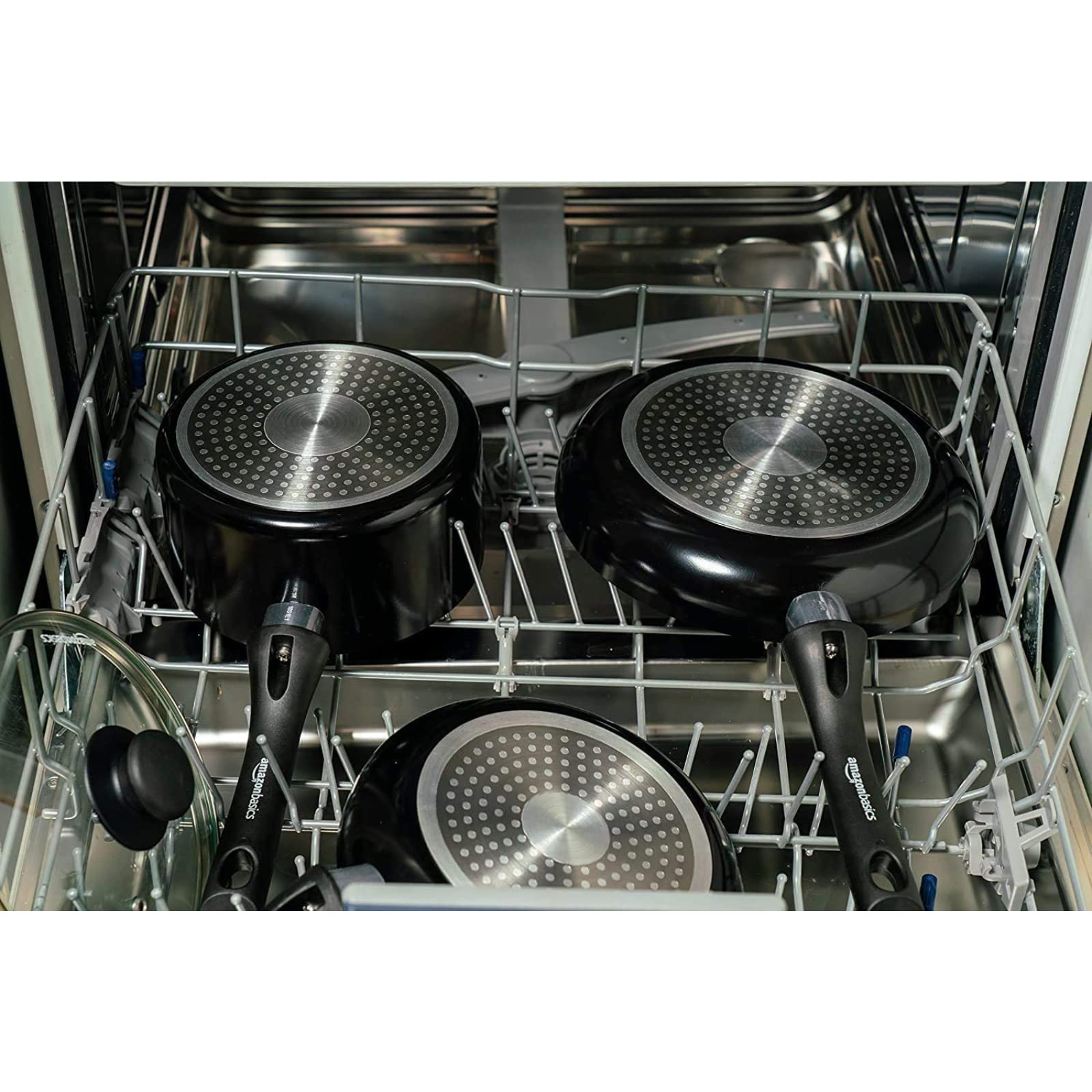 - El juego de utensilios de cocina antiadherente de 5 piezas incluye una sartén abierta de 20 x 4.2 cm, una sartén abierta de 24 x 4.5 cm, una cacerola cubierta de 16 x 8.3 cm, una cacerola cubierta de 18 x 9.3 cm y una cazuela cubierta de 20 x 10.9 cm