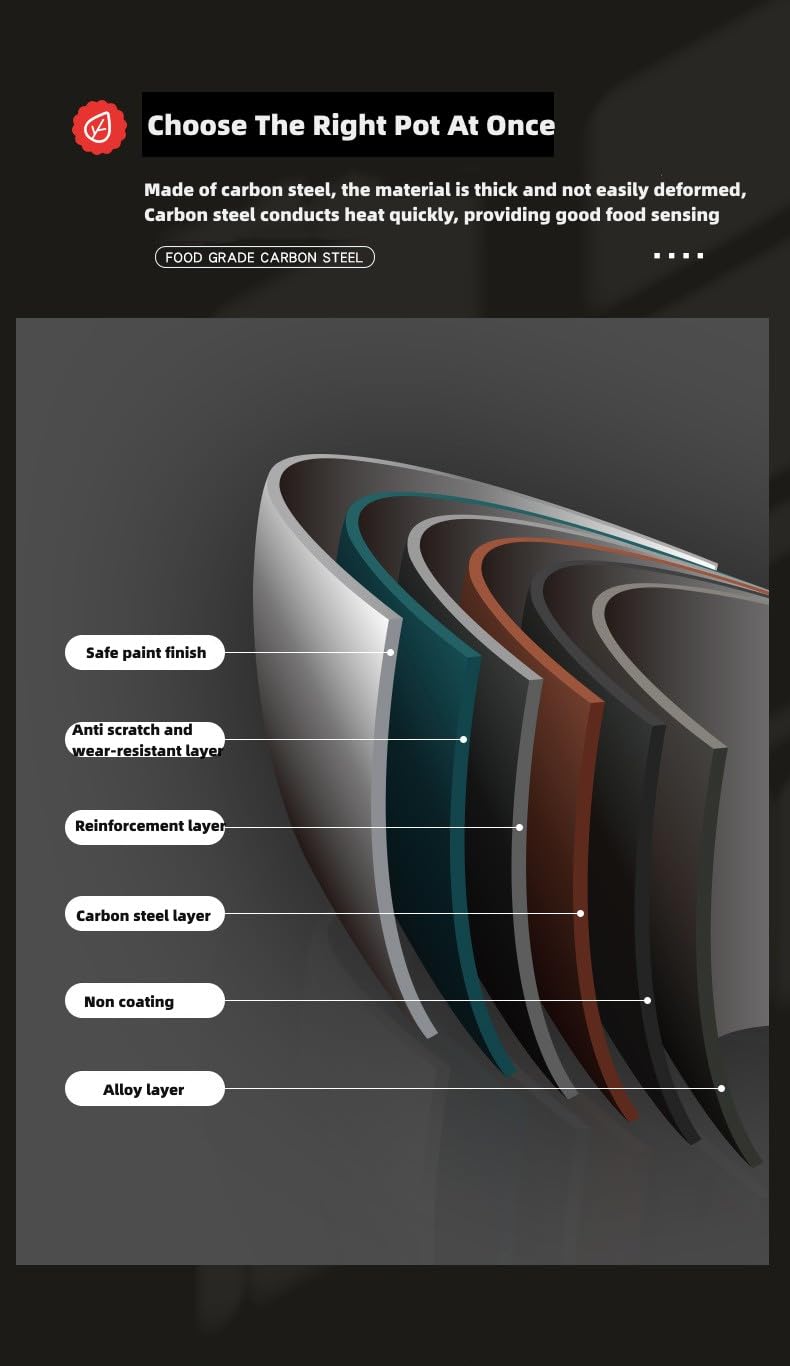 - Construcción Duradera y Multicapa : La batería de cocina Herzberg HG04241 está fabricada con materiales de alta calidad, incluyendo acero inoxidable y acero al carbono, asegurando una durabilidad y resistencia excepcionales. Su construcción de 6 capas incluye un acabado de pintura segura, una capa resistente a los arañazos y al desgaste, una capa de refuerzo, una capa de acero al carbono, un recubrimiento antiadherente y una capa de aleación. Este diseño multicapa garantiza no solo la durabilidad, sino también un rendimiento culinario óptimo, incluso con un uso frecuente.