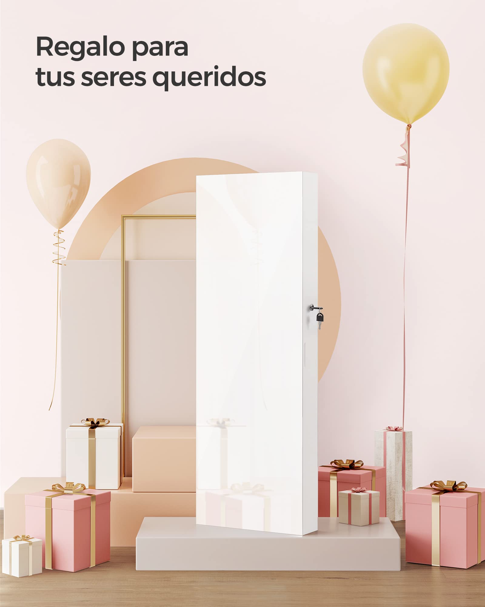- [En la puerta o en la pared] 2 posibilidades de instalación. Este armario joyero viene con 2 ganchos para colgarlo en una puerta, tornillos para colgarlo en la pared y 2 almohadillas protectoras en la parte posterior para la estabilidad