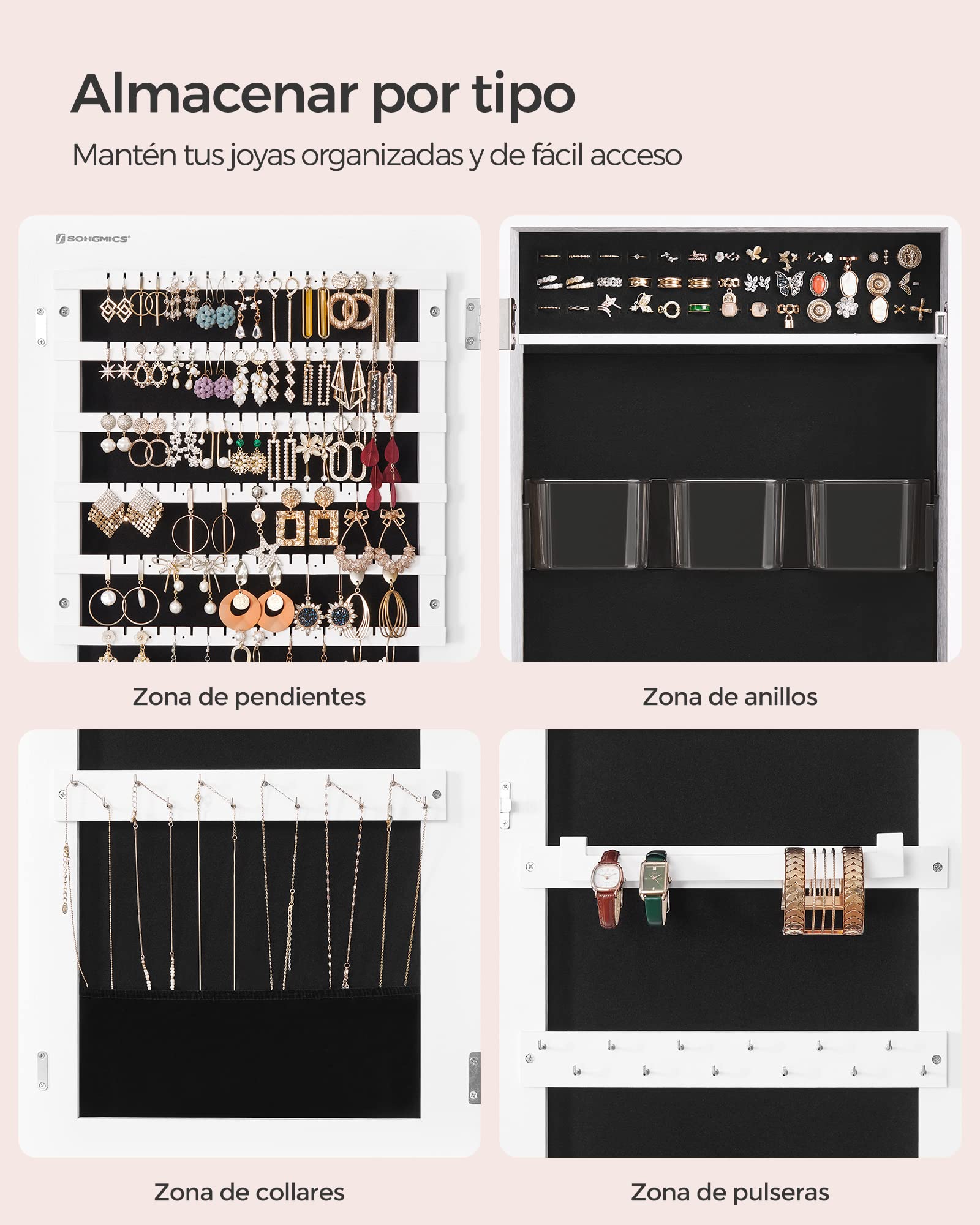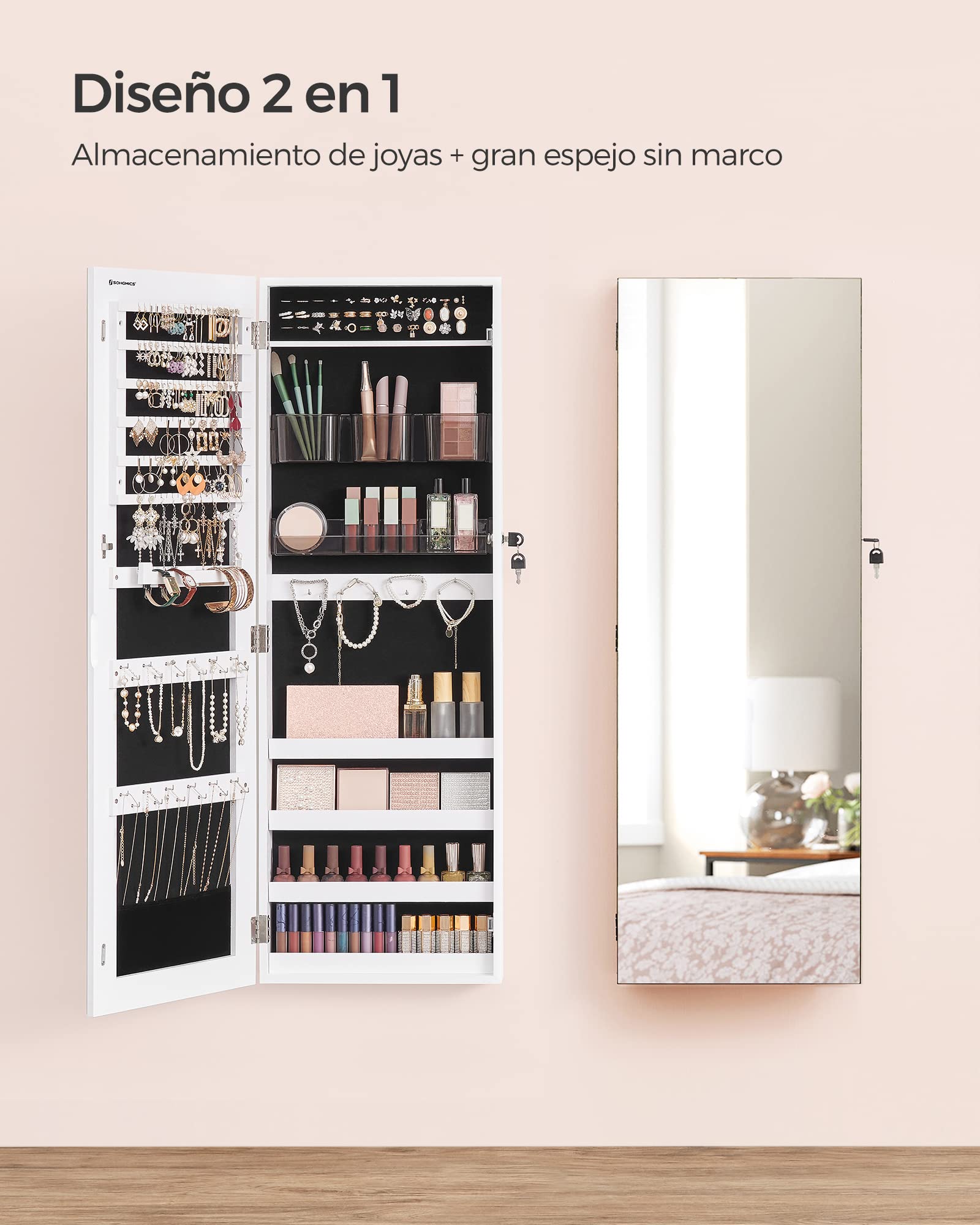 SONGMICS Espejo Joyero con Cerradura, Montado en Pared o Puerta, con Organizadores de Maquillaje, Blanco
